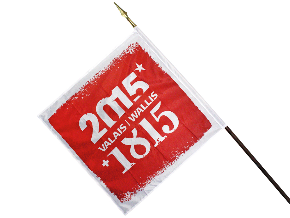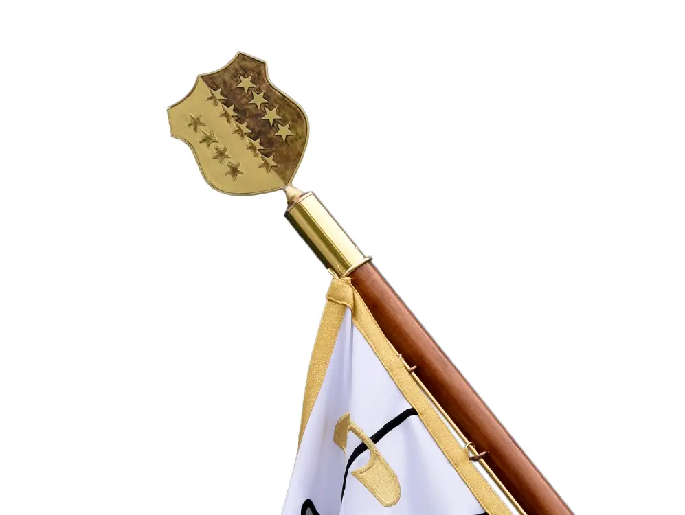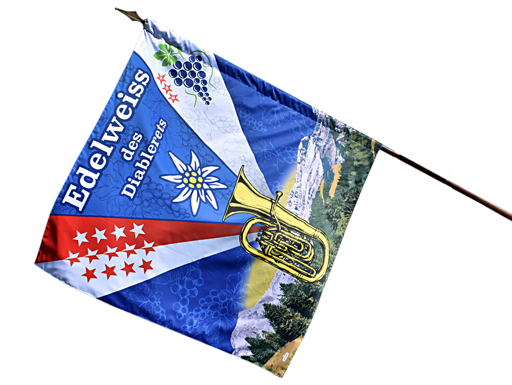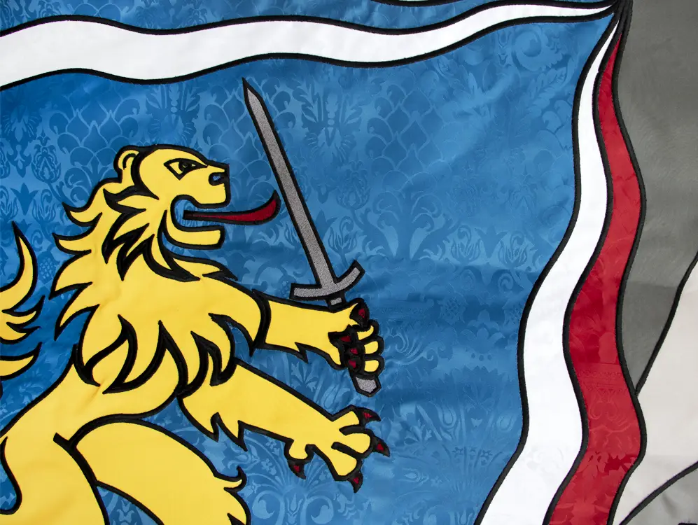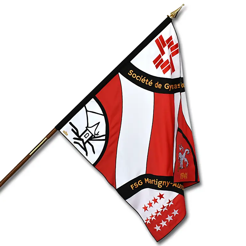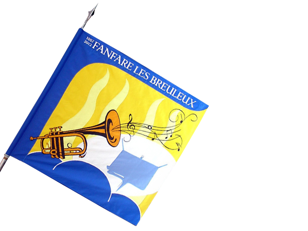 • Pour les budgets serrés, nous proposons un étendard double-face imprimé en digital sur du tissu polyester au lieu de réaliser les broderies à la main.